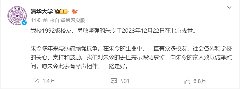 清華表示,朱令多年來與病痛頑強抗?fàn)?。在朱令的生命中,一直有眾多校友、社會各界和學(xué)校的關(guān)心、支持和鼓勵?!拔覀儗χ炝畹娜ナ辣硎旧钋邪У浚蛑炝畹募胰酥乱哉\摯慰問。愿朱令此去有琴聲相伴、一路走好。”