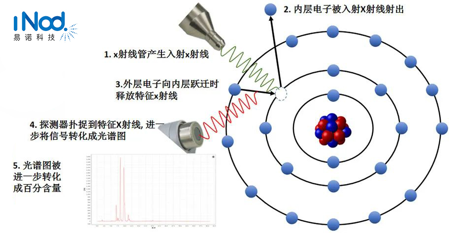 奧林巴斯手持式光譜儀的試樣中被測元素的原子受到來自于X射線管的一次X射線激發(fā)而引起內層電子的躍遷,同時發(fā)射出具有一定能量的X 射線二次熒光,利用高性能(能量分辨率<170eV)的X 射線硅漂移SDD檢測器探測試樣中被測元素所發(fā)出的各種能量的特征X 射線,根據(jù)檢測器輸出信號的能量大小和強度來對被測元素進行定性和定量分析。