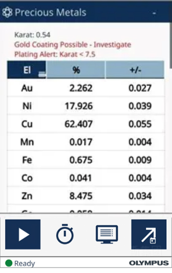 如圖所示,透過Vanta GX 貴金屬分析儀驗證金飾時,得知此金飾的純金含量只有2.262%的黃金(Au)含量,但鎳(Ni)含量為17.926%、銅(Cu)含量高達(dá)62.407%。故可得知此金飾為俗稱白銅的鎳銅合金,鍍金上一層薄薄的黃金,因為Vanta GX除了告知金屬含量為何外,若有遇到樣品疑似有鍍金(Coating)的狀況,也都會在窗口中一并告知(如圖上方的紅色警告字語)。