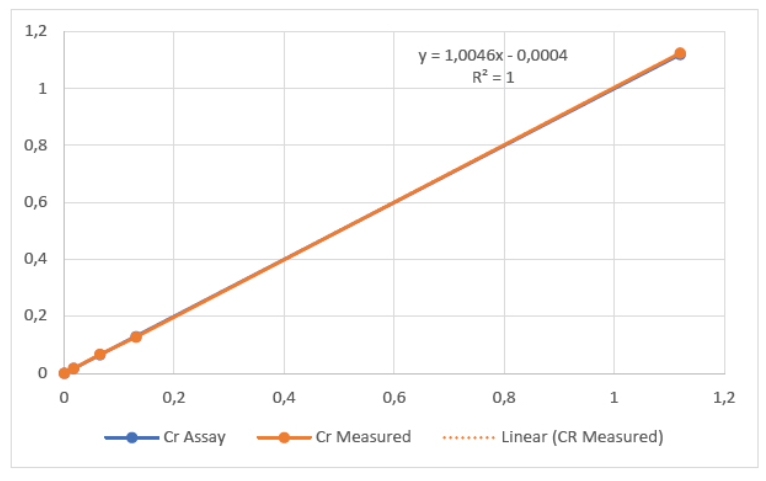 根據(jù)腐蝕模型的預(yù)測(cè),鉻含量低于0.04%的碳鋼會(huì)很容易受到流動(dòng)加速腐蝕。這個(gè)監(jiān)控閾值處于奧林巴斯Vanta分析儀測(cè)量鐵基鋼材中鉻元素含量的分析范圍內(nèi)。在碳鋼管道中加入少量的鉻,可以大大減少流體加速腐蝕的速度。因此,對(duì)碳鋼中低含量的鉻(Cr)進(jìn)行高精度的測(cè)量,是預(yù)測(cè)這些管道使用壽命的關(guān)鍵。