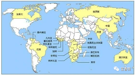 南非和北美有世界上很多重要的大型寶石礦山。集中在美洲西部科迪勒拉構(gòu)造帶-安第斯山脈一帶,主要產(chǎn)出國家有加拿大、美國、墨西哥、哥倫比亞、巴西。