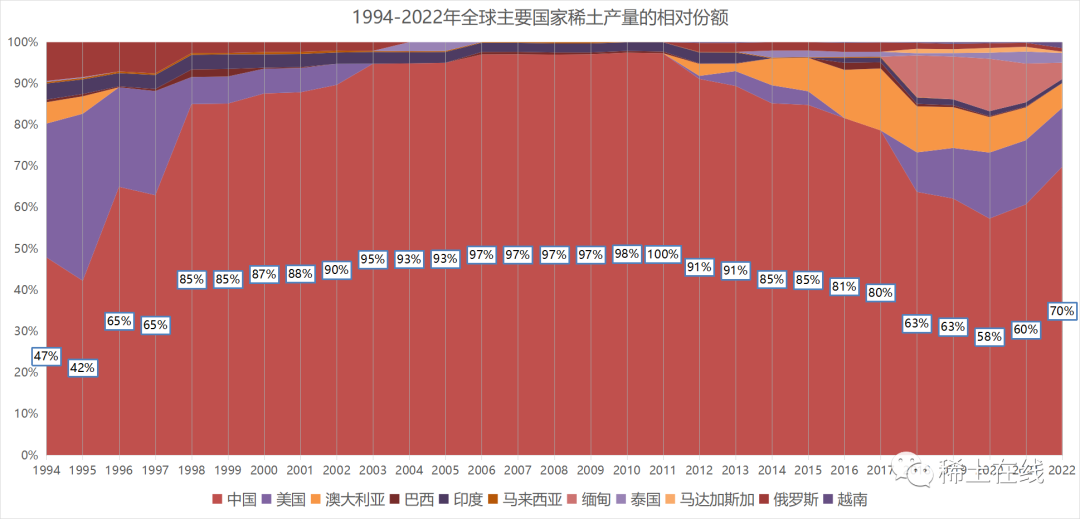 2022年,中國稀土礦產(chǎn)量占比為70%,較2021年60%有較大幅度增加,占據(jù)絕對領(lǐng)先的地位。