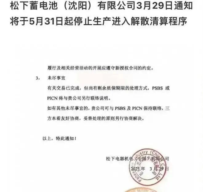 近日,位列世界500強企業(yè)松下株式會社旗下公司松下蓄電池(沈陽)工廠發(fā)布了一份公告,宣布將會在2023年5月31日前全面停止生產(chǎn),進入解散清算程序并不再開展任何經(jīng)營活動。意味著這個從1994年來沈陽投資建廠的企業(yè)結(jié)束了29年的生產(chǎn),正式退出了中國市場。