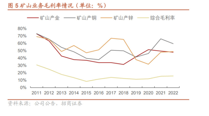 2022年,紫金礦業(yè)全年實(shí)現(xiàn)營(yíng)業(yè)收入達(dá)2703億元,凈利潤(rùn)達(dá)200.42億元,其中礦山產(chǎn)金毛利率47.97%,礦山產(chǎn)銅毛利率59.53%,礦山產(chǎn)鋅毛利率48.69%。