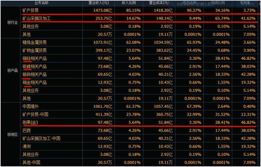 2022年,洛陽(yáng)鉬業(yè)實(shí)現(xiàn)營(yíng)業(yè)收入1729.91億元,凈利潤(rùn)為60.67億元,雖然創(chuàng)造歷史最好業(yè)績(jī),但相比于近2000億元的營(yíng)收,其實(shí)際的凈利潤(rùn)率并不高,而細(xì)看主營(yíng)業(yè)務(wù),其占了收入85%的礦產(chǎn)貿(mào)易,毛利率只有3.73%!而其礦產(chǎn)采掘和加工的業(yè)務(wù)的毛利率達(dá)到了41.62%,貢獻(xiàn)了總利潤(rùn)的65.74%。