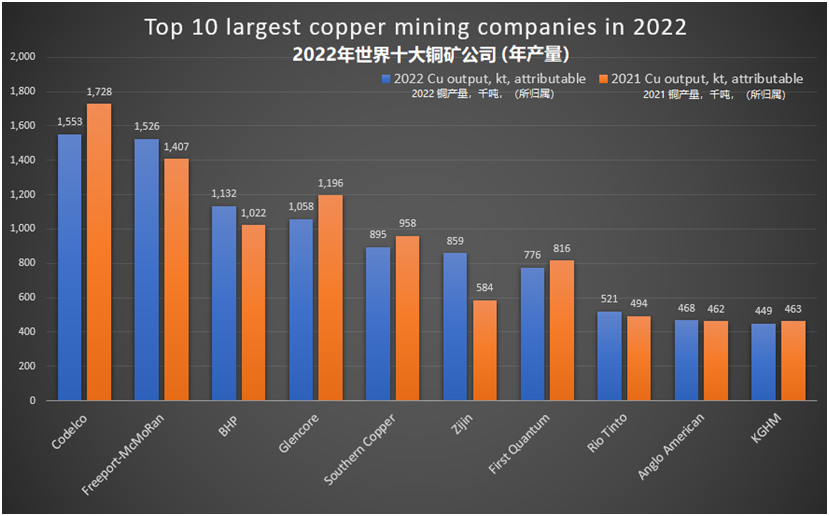 從2022年銅礦產(chǎn)量增加的礦企中,可以看出,自由港-麥克莫蘭公司(Freeport-McMoRan)在印尼的Grasberg礦山,必和必拓在澳大利亞的Olympic Dam礦山,紫金礦業(yè)在剛果(金)的Kamoa銅礦,塞爾維亞Timok銅金礦以及中國西藏巨龍銅礦......這些非南美地區(qū)的銅項目,成為了市場增量的重要組成。