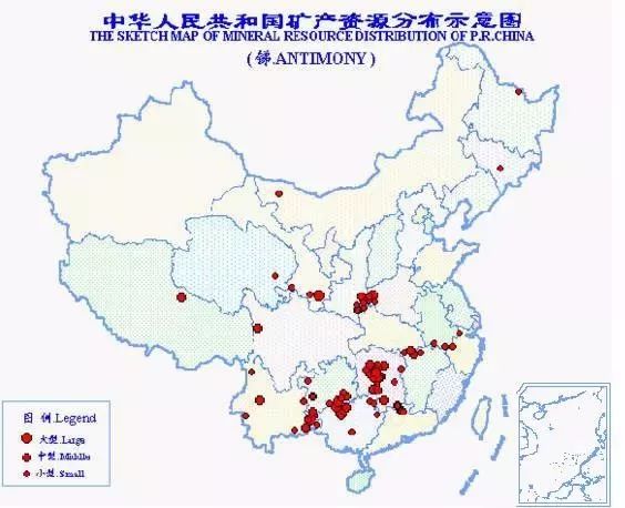 中國(guó)是世界上銻礦資源最為豐富的國(guó)家。總保有儲(chǔ)量銻278萬(wàn)噸,居世界第1位。已探明儲(chǔ)量的礦區(qū)有111處,分布于全國(guó)18個(gè)?。▍^(qū)),以廣西銻儲(chǔ)量為最多,約占全國(guó)的41.3%;其次為湖南、云南、貴州、甘肅、廣東等省。