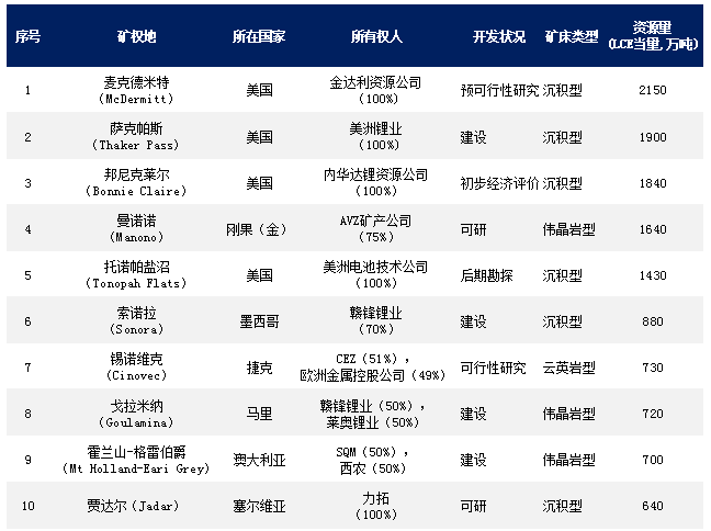 根據(jù)總資源量(LCE,碳酸鋰當(dāng)量,萬噸,以下同),Mining Intelligence網(wǎng)站列出了世界前十大粘土和硬巖鋰礦。