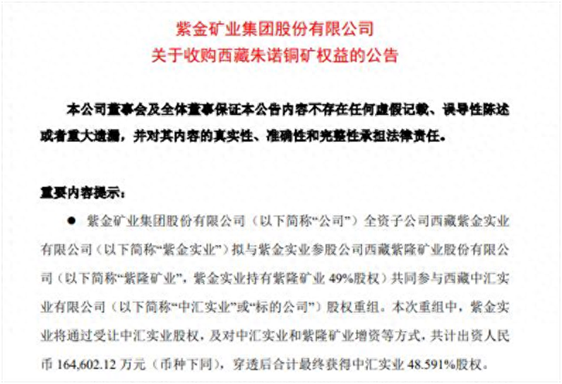 8月21日,紫金礦業(yè)宣布,以16.46億元收購中匯實業(yè)48.591%股權(quán),進而獲得國內(nèi)未開發(fā)超大型銅礦西藏朱諾銅礦的相對控股權(quán)。根據(jù)協(xié)議,未來,朱諾銅礦的建設(shè)及運營將由紫金礦業(yè)主導(dǎo)。