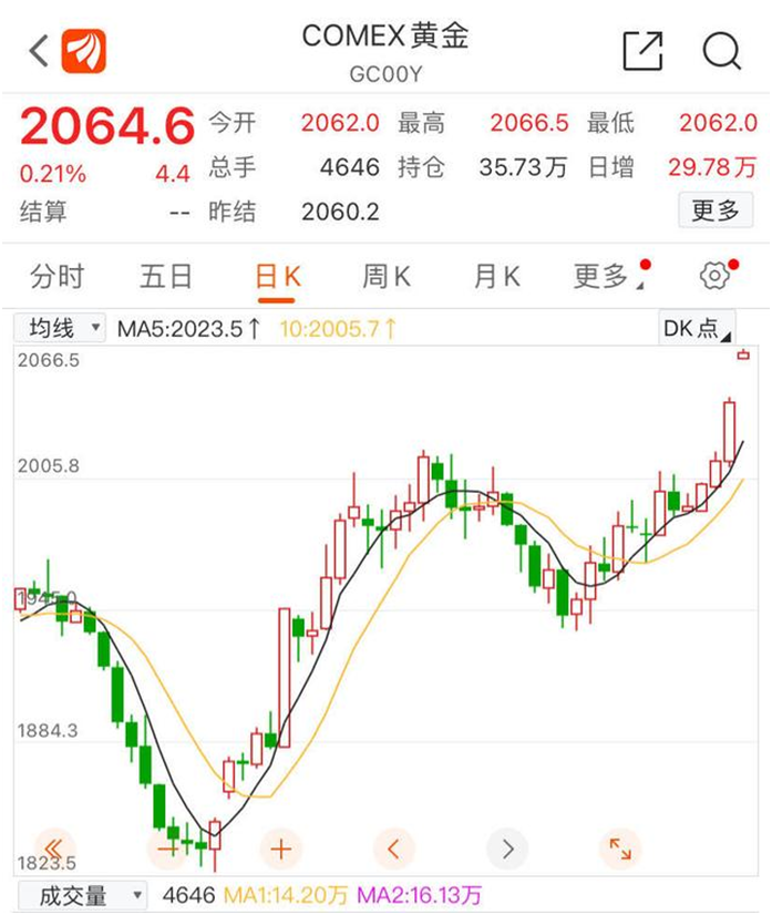 繼上周五國(guó)際金價(jià)突破2000美元關(guān)口后,11月29日紐約商品交易所COMEX12月黃金期貨持續(xù)收漲,截止29日八點(diǎn),該指數(shù)暫報(bào)2064.7美元,連漲四日且創(chuàng)5月中旬以來(lái)的半年新高,也越來(lái)越逼近2080美元的歷史最高。