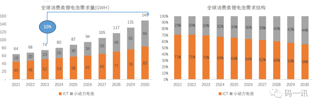 參考多個(gè)機(jī)構(gòu)數(shù)據(jù),未來消費(fèi)類電池需求以10%增速發(fā)展,預(yù)計(jì)30年總體需求144GWh, 其中ICT占56%份額,小型動(dòng)力電池44%;