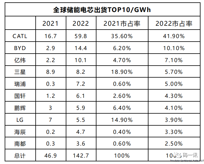從2022年的趨勢來看,以鋰三元電池為主的韓系廠家在儲(chǔ)能市場爆發(fā)的同時(shí)受惠有限,相對在儲(chǔ)能電池規(guī)格標(biāo)準(zhǔn)化的趨勢下,采用方形磷酸鋰鐵的中系儲(chǔ)能電芯廠家出貨量顯著增長。