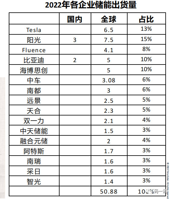 2022年Tesla、陽光、比亞迪、海博思創(chuàng)、Fluence市場份額占據(jù)全球前五,高達(dá)56%,整體市場分散,頭部企業(yè)尚未形成