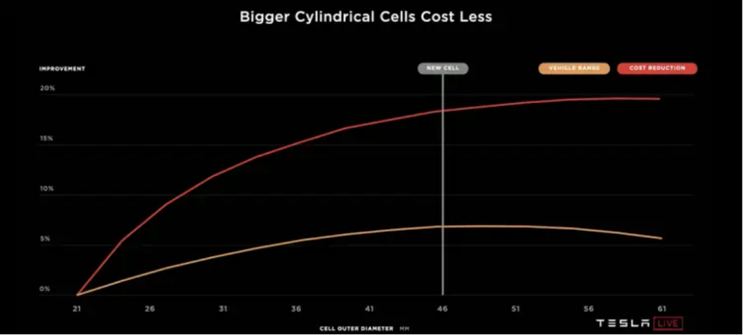 相比方形電池,圓柱電池在封裝為電池包時,圓柱與圓柱之間會有縫隙,空間利用率比較低,圓柱體積的增大可以減少縫隙,有研發(fā)人員指出,車用圓柱電池直徑控制在45- 50 毫米時能最好地兼顧電池容量和空間利用率,特斯拉在經(jīng)過多方實驗,遍歷所有關(guān)鍵指標,發(fā)現(xiàn)46mm是成本最小的電池外徑,直徑 46 mm、高 80 mm,是最完美的圓柱電池比例。