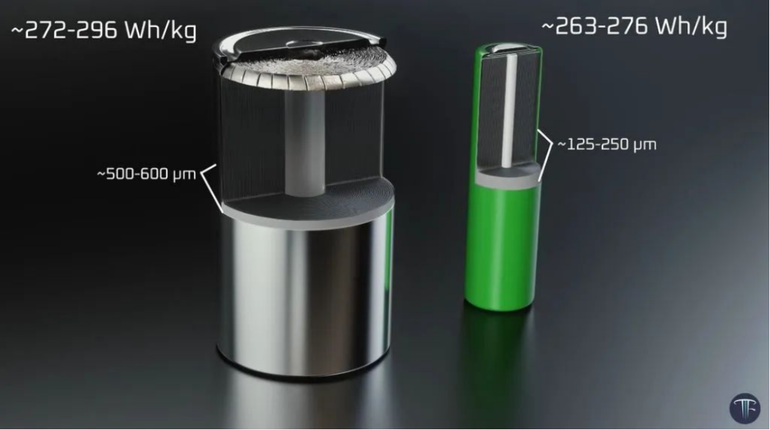 外形增大,減少了電池包中的單體電池數(shù)量,降低殼體在單位電池容量上的占比,結(jié)構(gòu)件和焊接數(shù)量也顯著減少,與2170電池相比,成本降低了14%。同時,電池組中金屬外殼占比減少,正極、負極等材料占比增加,能量密度提高。
