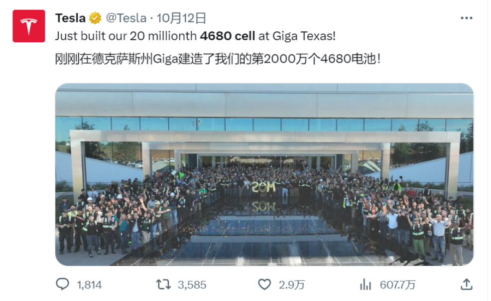 在不少質(zhì)疑聲中,特斯拉終于在今年10月份官宣其德州超級工廠在4680電池的生產(chǎn)上取得了重大突破,該工廠生產(chǎn)了第2000萬塊電池。而6月份特斯拉剛宣布其德州工廠生產(chǎn)了第1000萬塊4680電池,用4個月將產(chǎn)量翻番,這無疑是巨大的進步。