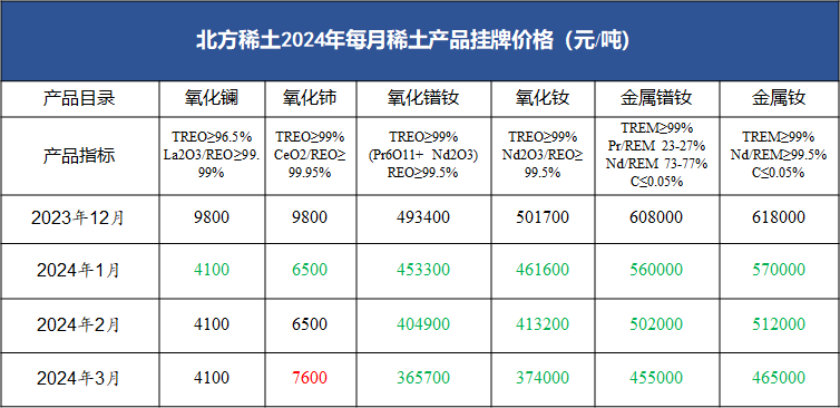 3月1日晚間,北方稀土發(fā)布2024年3月稀土產(chǎn)品掛牌價格,多個稀土產(chǎn)品價格環(huán)比均出現(xiàn)較大幅度下跌,僅氧化鈰價格環(huán)比出現(xiàn)上漲。
