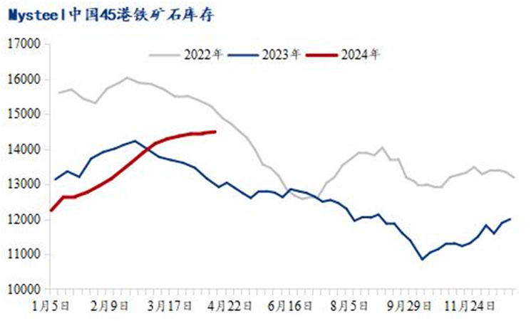 港口庫存方面,4月15日,中國45港進口鐵礦石庫存總量14656.54萬噸,環(huán)比上周一增加190萬噸,47港庫存總量15296.54萬噸,環(huán)比增加245萬噸。目前累庫有所放緩,五一節(jié)前鋼廠補庫力度,廠內(nèi)庫存或小幅增加,后續(xù)在疏港增加之下,港口庫存或逐步迎來庫存拐點,但4月份仍難降庫。