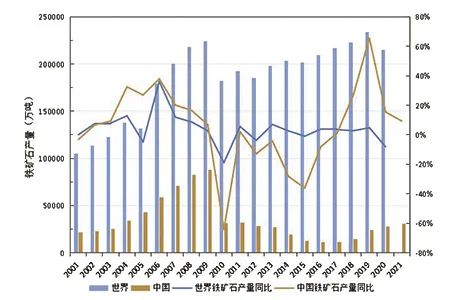 2001—2021年全球及中國鐵礦石產(chǎn)量對(duì)比
