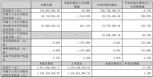 近日,云南鍺業(yè)發(fā)布財報,今年前三季度,公司實現(xiàn)營業(yè)收入5.03億元,同比增長6.74%;歸屬于上市公司股東的凈利潤2947.45萬元,同比增長706.02%。