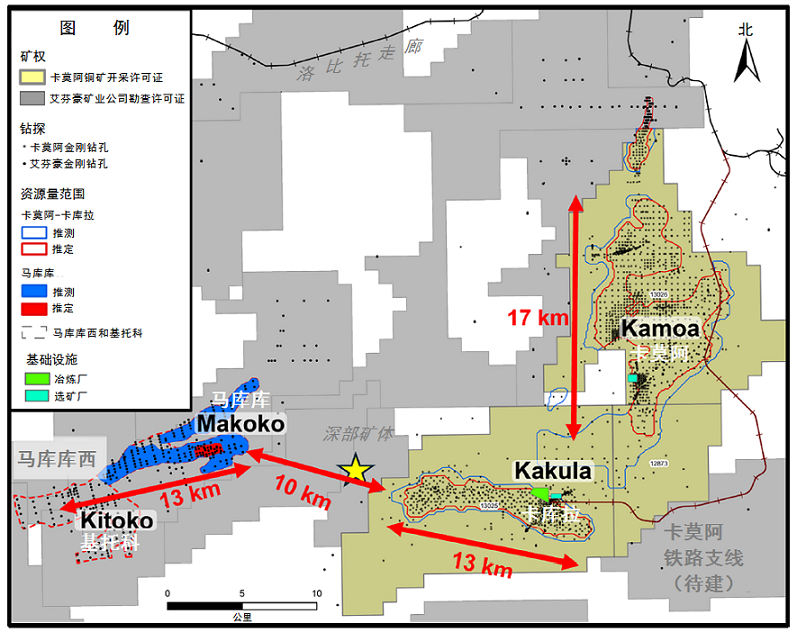 卡庫(kù)拉與馬庫(kù)庫(kù)之間部署的一個(gè)鉆孔在1300米深處見到銅礦化。盡管埋藏深,但礦化出現(xiàn)表明卡庫(kù)拉西與馬庫(kù)庫(kù)通過恩查納(Nchana)斷層可能是連在一起的。這個(gè)新礦區(qū)后續(xù)將開展工作。