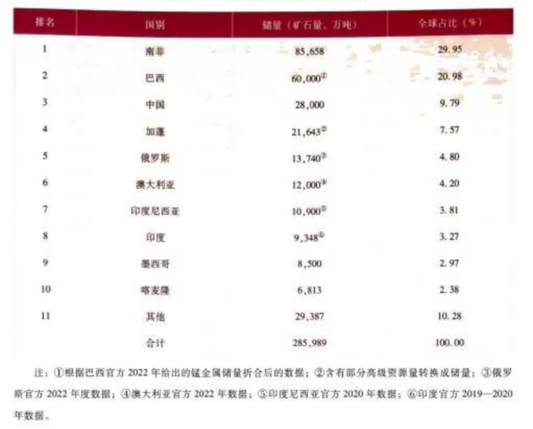 錳礦,是一種非常重要的戰(zhàn)略礦產(chǎn)資源,尤其是富錳礦和優(yōu)質(zhì)錳礦資源,已經(jīng)被中國(guó)列入到緊缺的礦種。錳及其化合物應(yīng)用于國(guó)民經(jīng)濟(jì)的各個(gè)領(lǐng)域,每輛特斯拉Model 3需要6.8公斤錳,而比亞迪刀片電池的磷酸錳鋰技術(shù)對(duì)高純度錳需求激增,錳已成為鋼鐵、新能源、新材料等產(chǎn)業(yè)的基本原料。從儲(chǔ)量分布來(lái)看,根據(jù)中國(guó)地調(diào)局發(fā)布的《全球礦產(chǎn)資源儲(chǔ)量評(píng)估報(bào)告2024》顯示,全球錳儲(chǔ)量28.6億噸(礦石量,下同),主要分布在南非(29.95%)、巴西(20.98%)、中國(guó)(9.79%)和加蓬(7.57%)等國(guó),俄羅斯、澳大利亞、印度尼西亞、印度、墨西哥和喀麥隆等國(guó)家也有少量分布。