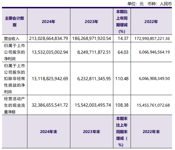 3月21日,洛陽(yáng)鉬業(yè)發(fā)布的業(yè)績(jī)報(bào)告顯示,公司2024年?duì)I業(yè)收入首次邁入兩千億元門檻,為2130.29億元,同比增長(zhǎng)14.37%;歸母凈利潤(rùn)首破百億元,為135.32億元,同比增長(zhǎng)64.03%;扣非后歸母凈利潤(rùn)131.19億元,同比增長(zhǎng)110.48%;每股收益0.63元,同比增長(zhǎng)65.79%。