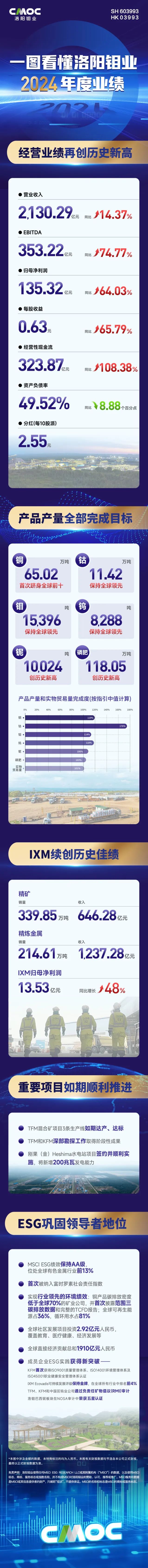2024年,洛陽(yáng)鉬業(yè)銅、鈷、鈮、磷肥產(chǎn)量創(chuàng)歷史新高:產(chǎn)銅65.02萬(wàn)噸,同比增長(zhǎng)55%,首次躋身全球前十大銅生產(chǎn)商,也是去年全球產(chǎn)銅增量最大的公司,產(chǎn)鈷11.42萬(wàn)噸;產(chǎn)鈮10,024噸,同比增長(zhǎng)5%,磷肥產(chǎn)量118萬(wàn)噸。公司還產(chǎn)鎢8,288噸,同比增長(zhǎng)4%,產(chǎn)鉬15,396噸。IXM協(xié)同礦山板塊,提升組織和運(yùn)營(yíng)效率,實(shí)現(xiàn)歸母凈利潤(rùn)13.53億元,同比增長(zhǎng)48%,再度刷新歷史最佳業(yè)績(jī)。