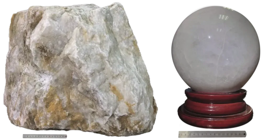 我國(guó)脈石英高純石英優(yōu)質(zhì)原料或A級(jí)礦(左)和安哥拉脈石英加工的石英球(右)。成都自然博物館(成都理工大學(xué)博物館)/ 藏