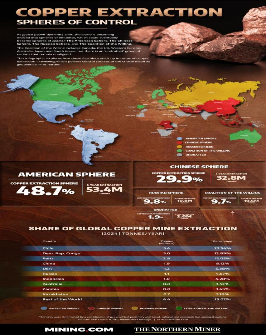 從世界維度來(lái)看,美國(guó)作為頭號(hào)資本強(qiáng)國(guó),通過(guò)跨國(guó)礦業(yè)巨頭控制著全球眾多優(yōu)質(zhì)銅礦資源。美國(guó)本土占主導(dǎo)的是斑巖型銅礦,依賴大規(guī)模露天開采和先進(jìn)選礦技術(shù),環(huán)保成本較高,銅礦平均品位較低(0.4%-0.6%),低于智利(0.7%-1%),開采成本較高(全球前10大低成本銅礦中無(wú)美國(guó)項(xiàng)目)。出于資本逐利的本性,跨國(guó)礦業(yè)巨頭優(yōu)先“掐尖”占有和開發(fā)全球成本最低的優(yōu)質(zhì)銅礦,這也是美國(guó)國(guó)內(nèi)銅礦開發(fā)滯后的一個(gè)重要原因。近期MINING網(wǎng)站和北方礦業(yè)從地緣政治的角度繪制了銅資源控制全球地圖,根據(jù)地理、社會(huì)、文化和經(jīng)濟(jì)聯(lián)系以及在更加兩極分化的世界中可能出現(xiàn)的結(jié)盟,將世界的銅資源分成五個(gè)“控制范圍”:美國(guó)、中國(guó)、俄羅斯、自愿聯(lián)盟和未開發(fā)。過(guò)去五年,美國(guó)以48.7%的全球銅產(chǎn)量領(lǐng)先,中國(guó)以29.9%緊隨其后,俄羅斯和自愿聯(lián)盟各占不到10%,還有1.9%未被開發(fā)。通過(guò)此圖可以看出,美國(guó)資本所控制的跨國(guó)礦業(yè)集團(tuán)還是優(yōu)先開發(fā)全球具有成本競(jìng)爭(zhēng)力的銅礦項(xiàng)目。