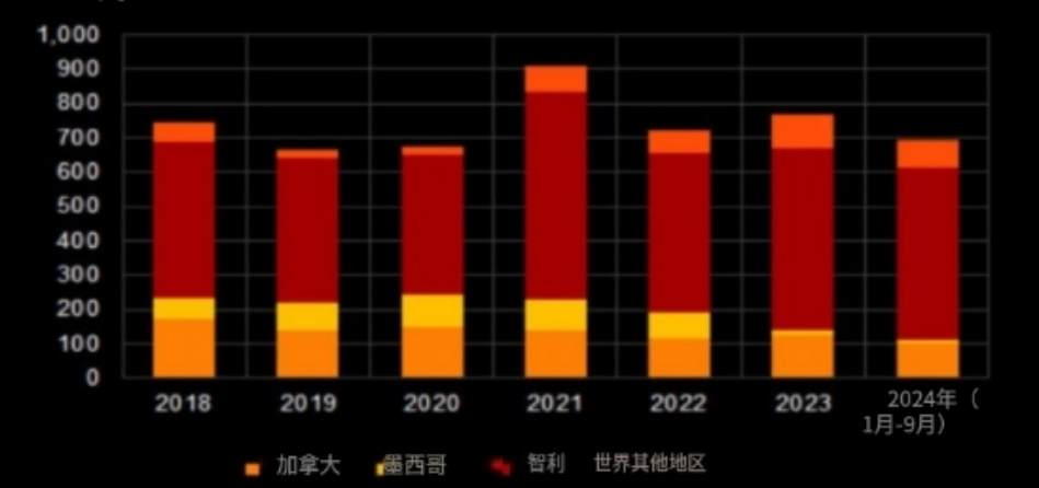 根據(jù)2025年USGS發(fā)布數(shù)據(jù),2024年美國(guó)共有25個(gè)銅礦山,其中17個(gè)占總產(chǎn)量99%以上。由于礦石品位降低,銅礦產(chǎn)量比2023年下降3%,國(guó)內(nèi)開采銅產(chǎn)量為110萬(wàn)噸,位列全球第五。精煉銅產(chǎn)量為89萬(wàn)噸,比2023年略有增長(zhǎng),位居全球第六。精煉銅進(jìn)口81萬(wàn)噸,主要來(lái)自智利65%、加拿大17%、墨西哥9%、秘魯6%、其他國(guó)家3%?;厥浙~約占美國(guó)銅供應(yīng)的35%,美國(guó)是世界上最大的廢銅出口國(guó),每年出口近百萬(wàn)噸,大部分被運(yùn)到中國(guó)進(jìn)行加工。通過(guò)以上數(shù)據(jù)可以看出,一方面是美國(guó)國(guó)內(nèi)銅礦資源開發(fā)緩慢,另一方面是國(guó)內(nèi)冶煉加工能力短板凸顯。