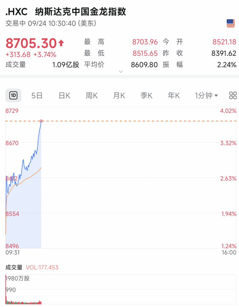 截至收盤,納斯達(dá)克中國金龍指數(shù)收漲2.83%,熱門中概股普漲。