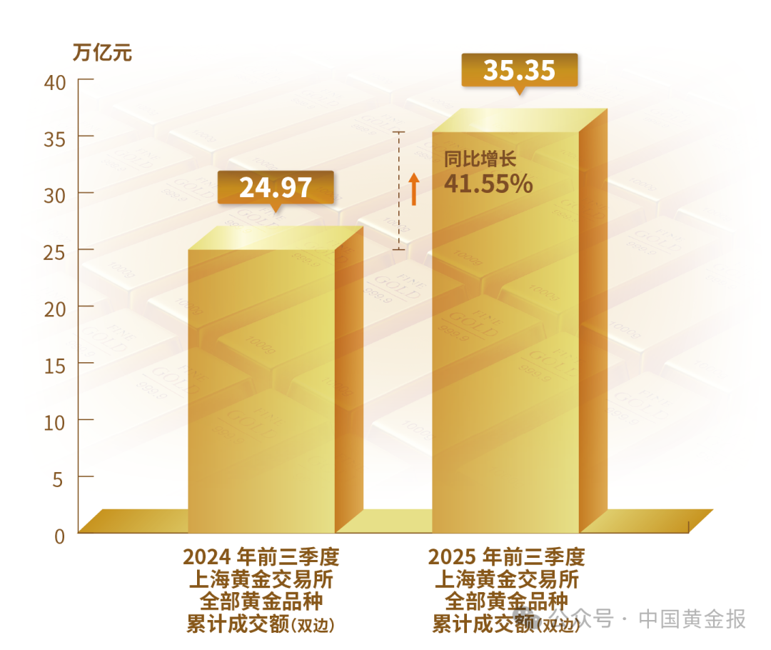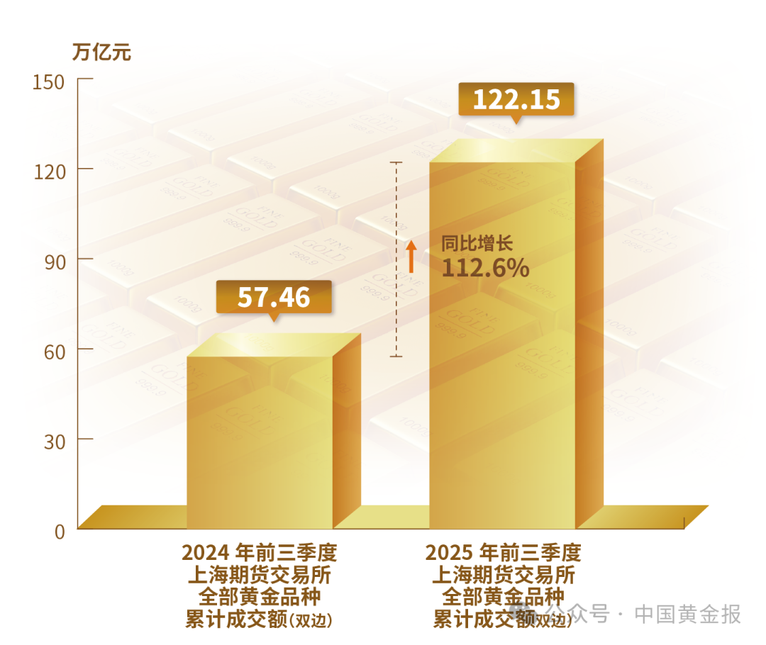 不同品類黃金產(chǎn)品的表現(xiàn)差異明顯。輕克重、附加值高的首飾產(chǎn)品仍保持較強(qiáng)市場吸引力,銷售情況較好。金條需求仍然旺盛,地緣沖突加劇與經(jīng)濟(jì)不確定性使得黃金避險保值的功能進(jìn)一步凸顯。電子、新能源等產(chǎn)業(yè)的快速發(fā)展使得工業(yè)用金需求穩(wěn)步回升。 黃金市場 2025年前三季度,上海黃金交易所全部黃金品種累計(jì)成交量單邊2.38萬噸(雙邊4.76萬噸),同比上升2.45%;累計(jì)成交額單邊17.68萬億元(雙邊35.35萬億元),同比上升41.55%。上海期貨交易所全部黃金期貨期權(quán)累計(jì)成交量單邊10.36萬噸(雙邊20.72萬噸),同比上升59.98%;累計(jì)成交額單邊61.08萬億元(雙邊122.15萬億元),同比上升112.6%。