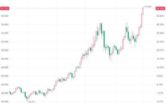 白銀市場表現(xiàn)強勁,Wind數(shù)據顯示,12月1日,國際銀價一度突破57美元/盎司關口,再創(chuàng)新高;COMEX白銀首次突破58美元/盎司;滬銀主力合約盤中最高漲超7%,達13520元/千克,創(chuàng)下新高。今年以來,國際銀價已上漲超90%,大幅跑贏黃金。