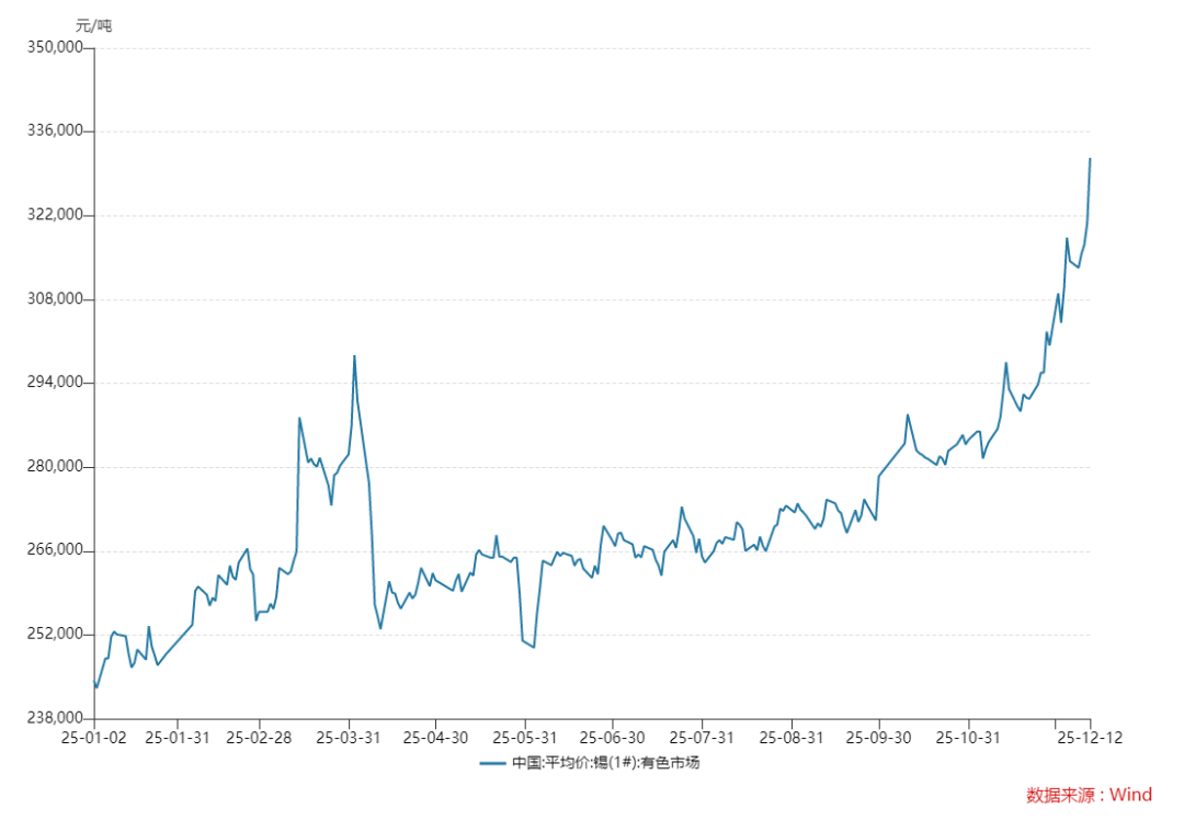12月12日,國(guó)內(nèi)現(xiàn)貨錫價(jià)在突破每噸33萬(wàn)元整數(shù)關(guān)口后繼續(xù)上行,Wind數(shù)據(jù)顯示,錫(1#)當(dāng)日?qǐng)?bào)價(jià)達(dá)331,640元/噸,單日上漲10,870元,年內(nèi)累計(jì)漲幅約37%,價(jià)格攀升至2022年6月以來(lái)的最高位。同期,滬錫期貨主力合約亦大幅收高,市場(chǎng)看漲情緒顯著。